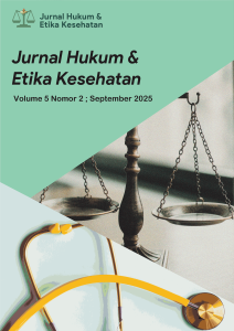 Jurnal Hukum dan Etika Kesehatan (JHEK) seeks to provide comprehensive, practical, and current insights for academics, legal practitioners, healthcare professionals, policymakers, and students interested in the intersection between law and health. JHEK serves as a platform for exchanging ideas, promoting critical debate, and advancing the understanding of legal and ethical issues in healthcare governance and public health systems. It has one volume with two issues per year (March and September). JHEK has been indexed in Sinta 5 Journal.